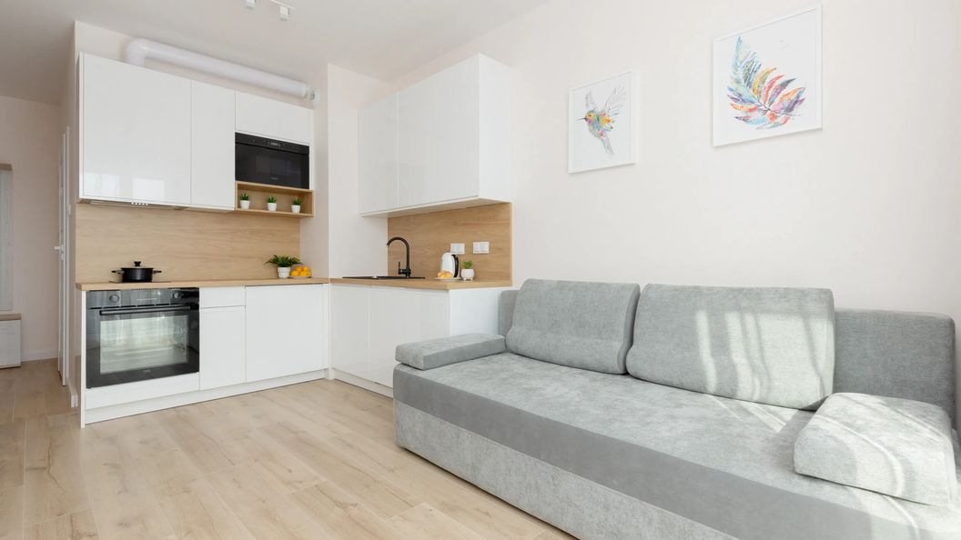 Ten komfortowy apartament znajduje się na 2. piętrze i ma możliwość zakwaterowania 4 osób - to idealny wybór zarówno dla osób podróżujących samotnie, w parze, a także dla rodzin czy grup przyjaciół. Funkcjonalnie zaprojektowane wnętrze o powierzchni 36 m² oferuje salon z aneksem kuchennym, sypialnię z wygodnym łóżkiem oraz łazienkę z prysznicem. Dodatkowo, do apartamentu przynależy balkon z widokiem na otaczające tereny osiedla, gdzie można cieszyć się poranną kawą, czy odpocząć po dniu pełnym atrakcji. Część mieszkalna jest wyposażona w wygodną sofę i TV, co stanowi doskonałe miejsce odpoczynku oraz relaksu. W sypialni znajduje się wygodne łóżko małżeńskie gwarantujące udany pobyt. Goście mogą skorzystać z powitalnego zestawu kosmetyków (mydło, szampon i żel pod prysznic), ręczników i szerokiej gamy przedmiotów gospodarstwa domowego, takich jak żelazko, odkurzacz czy pralka oraz z dostępnego miejsca do pracy zdalnej – biurka z krzesłem. Udogodnienia obejmują wyposażenie multimedialne: telewizor z płaskim ekranem oraz bezpłatne łącze internetowe Wifi. Apartament wyróżnia się starannym wykończeniem, estetyką oraz funkcjonalnością. Jasna, przyjemna aranżacja wnętrza zapewnia mieszkaniu domowy i przyjemny klimat, idealny do wypoczynku po całym dniu zwiedzania.