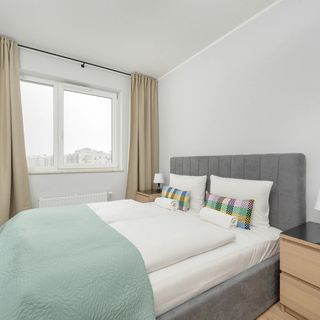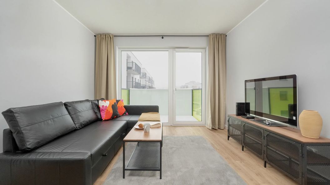 Wyjątkowy apartament z przyjemnością ugości 4 osoby, a zlokalizowany jest na nowoczesnym osiedlu mieszkaniowym. Posiada powierzchnię 50 m2, co czyni go bardzo przestronnym i idealnym na pobyt z rodziną lub znajomymi. Składa się on z salonu, osobnej sypialni, aneksu kuchennego, łazienki oraz balkonu. Balkon jak również cały budynek posiadają urocze kolorowe akcenty. Wystrój apartamentu w jasnych kolorach, z elementami wykonanymi z drewna sprawia, że pobyt w nim będzie relaksujący i przyjemny. Salon posiada rozkładaną sofę, przeznaczoną do spania dla dwóch osób, a także duży telewizor. W sypialni znajduje się podwójne łóżko małżeńskie oraz biurko z krzesłem, które umożliwi naszym Gościom zadbanie o obowiązki służbowe. Zapewniony został również dostęp do Internetu w postaci sieci WIFI. Aneks kuchenny został w pełni wyposażony we wszystkie niezbędne akcesoria, a także stół do wspólnego spożywania posiłków. Przytulna łazienka posiada nowoczesną kabinę prysznicową, pralkę, ręczniki i zestaw kosmetyków. Do apartamentu przynależy miejsce parkingowe w garażu podziemnym, wliczone w cenę rezerwacji.