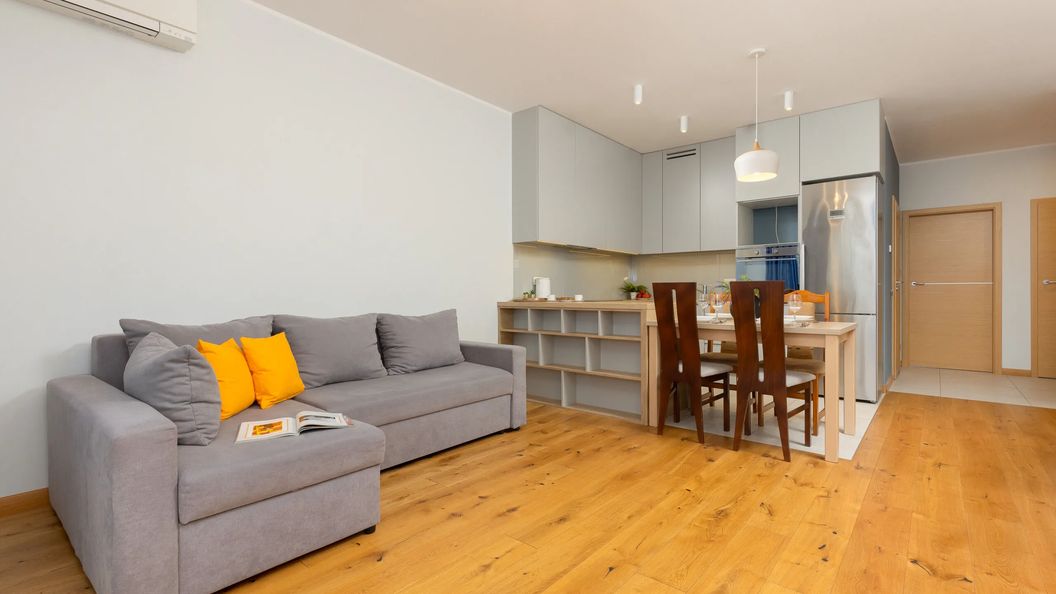 Ten stylowy apartament posiada powierzchnię 60 m² i z przyjemnością ugości 6 osób. Będzie idealnym wyborem dla rodzin z dziećmi oraz grup przyjaciół, pragnących zwiedzić stolicę. Apartament składa się z salonu z aneksem kuchennym, 2 osobnych sypialni, łazienki oraz umeblowanego balkonu. Jego wykończenie to drewniane elementy, jasne barwy i idealnie komponujące się wyposażenie. Został on zaprojektowany z dbałością o najmniejsze szczegóły. Nasi Goście będą mogli poczuć się tutaj jak w domu. Salon stanowi przestronne wnętrze z wygodną, rozkładaną sofą oraz stołem z krzesłami. Wyposażenie multimedialne apartamentu stanowi telewizor z funkcją SmartTV oraz dostęp do Internetu w postaci sieci WIFI. Aneks kuchenny posiada wszystkie niezbędne przedmioty do przygotowywania posiłków. Znajdują się w nim takie udogodnienia jak piekarnik, zmywarka, czajnik elektryczny oraz lodówka. Stół z krzesłami pozwoli na komfortowe spożywanie posiłków z całą rodziną. W pierwszej sypialni znajduje się wygodne łóżko małżeńskie oraz pojemna szafa. Druga sypialnia została wyposażona w dwa łózka pojedyncze, a także komodę do przechowywania. Apartament posiada umeblowany balkon oraz przytulną łazienkę z prysznicem. Dla naszych Gości oferujemy bezpłatny zestaw kosmetyków i ręczniki w łazience. W apartamencie zapewniona jest oczywiście świeża pościel.