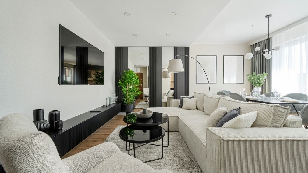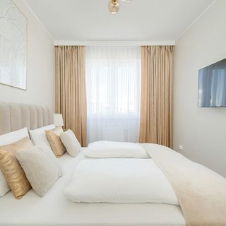 Piękny apartament, urządzony w ciepłych kolorach posiada powierzchnię 66 m² i może ugościć 6 osób. Będzie doskonałym miejscem noclegowym dla rodzin z dziećmi lub grup przyjaciół spędzających razem urlop we Wrocławiu. Przestrzeń została wypełniona jasnymi kolorami bieli, szarości oraz beżu, stwarza to niezwykłą atmosferę spokoju i wprawi naszych Gości w pozytywny nastrój. Apartament składa się z salonu, dwóch osobnych sypialni, aneksu kuchennego, łazienki oraz dużego balkonu. W salonie znajduje się podwójna rozkładana sofa, nowoczesny telewizor, fotel oraz stół z krzesłami, przy którym można wygodnie spożywać posiłki. Został zapewniony również dostęp do Internetu w postaci sieci WIFI. Pierwsza sypialnia posiada komfortowe łóżko małżeńskie oraz świeżą pościel dla naszych Gości. W drugiej sypialni również znajduje się łóżko małżeńskie i pojemna szafa. Aneks kuchenny został wyposażony we wszystkie przybory, niezbędne do przygotowywania posiłków oraz takie udogodnienia jak zmywarka, piekarnik czy zestaw do parzenia kawy i herbaty. W łazience znajduje kabina prysznicowa, pralka oraz suszarka do włosów. Na przestronnym balkonie zażyć można świeżego powietrza przy filiżance ulubionej kawy.