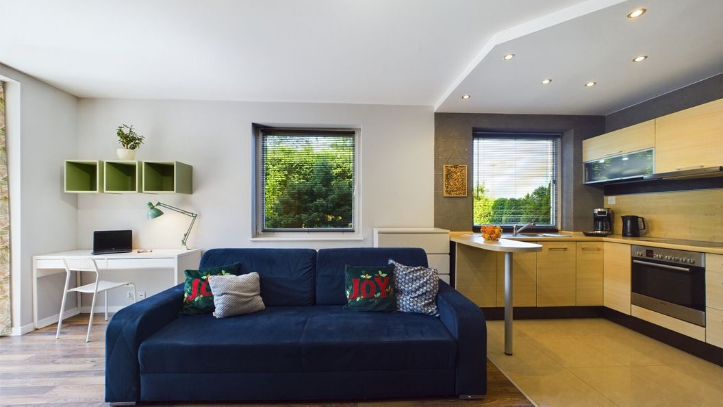 Apartament mieści się na parterze budynku i może pomieścić sześć osób. To idealna opcja dla dużej rodziny lub podróżującej wspólnie grupy. Miejsce jest nowocześnie urządzone, a wnętrze utrzymane jest w pięknych kolorach. Dwa miejsca noclegowe znajdują się w osobnej sypialni na dwój pojedynczych łóżkach, a kolejne cztery w salonie na podwójnej sofie rozkładanej i podwójnym łóżku typu king-size. Pyszny posiłek przygotować można za pomocą znajdującej się w aneksie kuchennym kuchenki elektrycznej, piekarnika oraz kuchenki mikrofalowej. Zaparzonej w dostępnym ekspresie przelewowym kawy można napić się na umeblowanym tarasie przynależącym do apartamentu. Mieszczący się tuż przy nim ogródek to doskonałe miejsce na relaks po dniu pełnym wrażeń lub wyciszenie pośród zieleni. Dodatkowo znaleźć w nim można gratkę dla najmłodszych – piaskownicę. Łazienka wyposażona jest w prysznic, ręczniki oraz specjalny zestaw bezpłatnych kosmetyków. Pralka z pewnością przyda się podczas dłuższych pobytów lub rodzinom z małymi dziećmi. Miejsce jest przystosowane dla osób pracujących zdalnie. W salonie mieści się biurko wraz z krzesłem, a we wszystkich pokojach połączyć się można z szybką siecią WiFI. Dodatkowe udogodnienie multimedialne stanowi telewizor z płaskim ekranem (SmartTV+) oraz dostępem do pakietu telewizji kablowej. Miejsce jest przyjazne zwierzętom – mile widziani są Goście podróżujący ze swoimi pupilami.