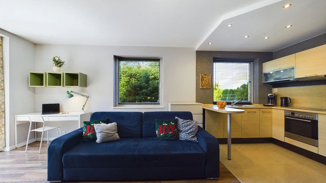 W apartamencie znajduje się aneks kuchenny wyposażony w niezbędne sprzęty, takie jak kuchenka elektryczna z piekarnikiem, zmywarka, kuchenka mikrofalowa oraz przelewowy ekspres do kawy. W łazience goście znajdą prysznic oraz pralkę. W salonie przygotowano także biurko z krzesłem, co umożliwia komfortową pracę zdalną.