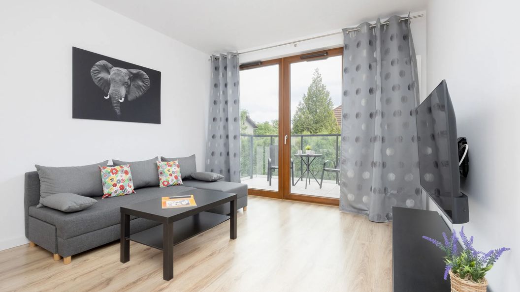 Ten nowoczesny i jasny apartament jest idealny na pobyt dla maksymalnie czterech osób. Został zaprojektowany z myślą o wygodzie i funkcjonalności, doskonale nadaje się zarówno na krótsze, jak i dłuższe pobyty. W głównym pomieszczeniu znajduje się rozkładana sofa oraz telewizor zapewniający rozrywkę. Z sypialni jest wyjście na umeblowany balkon, z którego roztacza się widok na ogród. Balkon jest wyposażony w meble ogrodowe, co tworzy przyjemną przestrzeń do wypoczynku na świeżym powietrzu, idealną na poranną kawę lub wieczorny relaks.