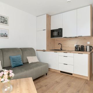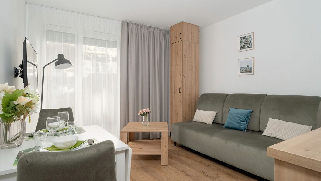 Jasne studio posiada powierzchnię 20 m² i może ugościć 2 osoby. Składa się ono z salonu, aneksu kuchennego, tarasu oraz łazienki. Wnętrza charakteryzują się wyjątkowym wystrojem, wysokiej jakości wyposażeniem oraz niezwykłą funkcjonalnością. Nasi Goście będą mogli poczuć się tutaj jak w domu i w pełni zrelaksować podczas pobytu w Poznaniu. W salonie znajduje się wygodna rozkładana sofa, która w nocy zamienia się w miejsce do spania dla 2 osób. Nowoczesny telewizor z funkcją SmartTV i dostęp do Internetu, w postaci sieci WIFI, zapewnią rozrywkę na długie wieczory.