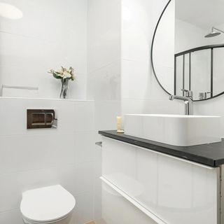 Prysznic, umywalka, lustro, ręczniki, pralka