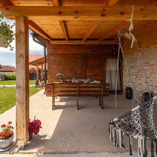 - Dom wykonany z drewna i cegły