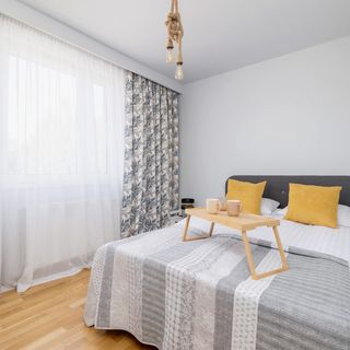 Ten przestronny, rodzinny apartament jest przeznaczony dla sześciu osób i znajduje się na drugim piętrze nowoczesnego budynku. Z umeblowanego balkonu, na którym stoi stolik z krzesłami, goście mogą podziwiać ładny widok na okolicę podczas picia porannej kawy na powietrzu. W salonie mieści się jasnoszara, rozkładana sofa dwuosobowa, a także przestrzeń jadalniana i telewizor z dostępem do kanałów kablowych, przy których można relaksować się wieczorami. W pomieszczeniu dostępny jest też funkcjonalnie wyposażony aneks kuchenny. O możliwość łatwego i szybkiego przygotowywania posiłków dbają praktyczne sprzęty, wśród których wymienić można piekarnik, czajnik elektryczny czy też kuchenkę indukcyjną. Salon ma do zaoferowania również stojące lustro. Lokal dysponuje dwiema sypialniami – w każdej z nich umieszczono wygodne łóżko dwuosobowe. W jednej z sypialni do dyspozycji odwiedzających jest dodatkowo pojemna szafa wraz z biurkiem i krzesłem do komfortowej pracy zdalnej. W łazience na gości czeka powitalny zestaw kosmetyków, pralka, prysznic, suszarka do włosów i ręczniki. Apartament został wyposażony również w wentylator.