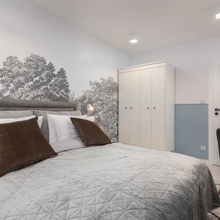 Podwójne łóżko, biurko z krzesłem, szafa, komplet pościeli