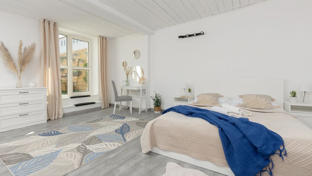 Podwójne łóżko, szafki nocne, fotel, komoda, komplet pościeli
