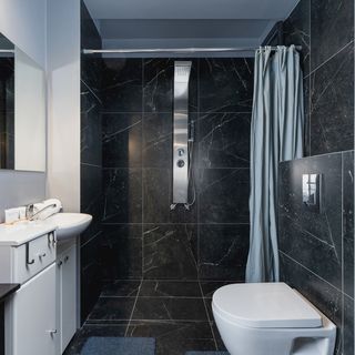 Prysznic, toaleta, umywalka, lustro, ręczniki, suszarka do włosów, pralka