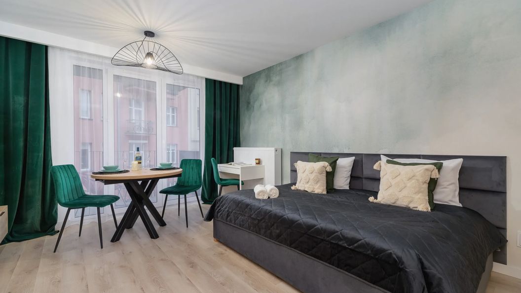 Piękne, w pełni wyposażone studio o wysokim standardzie może ugościć 2 osoby. Stanowi zatem idealne rozwiązanie na romantyczny wyjazd lub w celach biznesowych! Na przestrzeń apartament składa się z salon z łóżkiem małżeńskim, aneks kuchenny oraz łazienka z kabiną prysznicową i toaletą. Salon posiada również wyjście na przytulny balkon, gdzie można cieszyć się łykiem porannej, aromatycznej kawy. Szeroki wachlarz udogodnień oraz kompleksowe wyposażenie apartamentu w niezbędne akcesoria i sprzęty kuchenne, jak i łazienkowe gwarantuje komfort pobytu. Goście mogą skorzystać z powitalnego zestawu kosmetyków (mydło, szampon i żel pod prysznic), ręczników, pościeli oraz szerokiej gamy artykułów gospodarstwa domowego, takich jak żelazko czy odkurzacz. Studio posiada dostęp do szybkiego bezpłatnego Internetu Wifi, a także miejsce do pracy zdalnej lub nauki. Apartament ma nieodparty urok, dzięki eleganckiemu wystrojowi oraz wysokiej jakości materiałów. Harmonijny design i dbałość o szczegóły zadowolą nawet najbardziej wymagających gości.