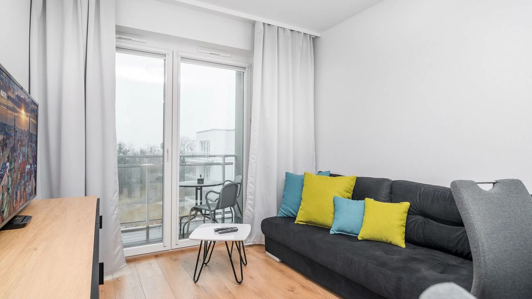 Sofa, pościel, stolik kawowy, TV, wyjście na balkon