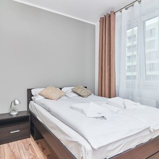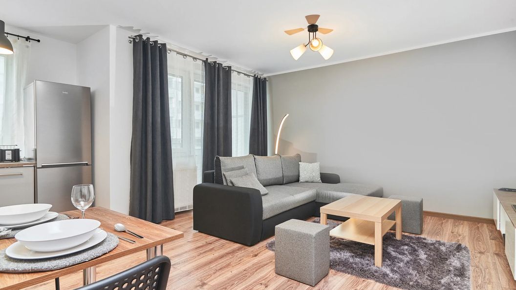 W pełni wyposażony, nowocześnie wykończony apartament przeznaczony jest dla 4 osób. Na powierzchnię 45 m² składa się salon z aneksem kuchennym, sypialnia, oraz łazienka z prysznicem. Apartament posiada również balkon wychodzący na cichą stronę osiedla, idealny na poranne rozbudzenie na świeżym powietrzu przy filiżance kawy. Funkcjonalna, jasna przestrzeń ma minimalistyczny wystrój w stonowanych kolorach, co daje poczucie przestronności i niewymuszonej swobody. Salon wyposażony jest w część wypoczynkową lub sypialnianą z podwójną rozkładaną sofą, natomiast w sypialni znajduje się podwójne łóżko. Aby zapewnić maksymalną wygodę, w apartamencie znajdują się liczne udogodnienia, takie jak bezpłatne WiFi, telewizor z płaskim ekranem, pralka i suszarka do włosów. W pełni wyposażony aneks kuchenny (w tym w mikrofalówkę, ekspres do kawy i zmywarkę do naczyń) ułatwia przygotowywanie posiłków, zwiększając samowystarczalność gości. Dodatkowo goście podróżujący samochodem mogą zaparkować za darmo na wyznaczonym, zewnętrznym miejscu parkingowym na terenie osiedla.