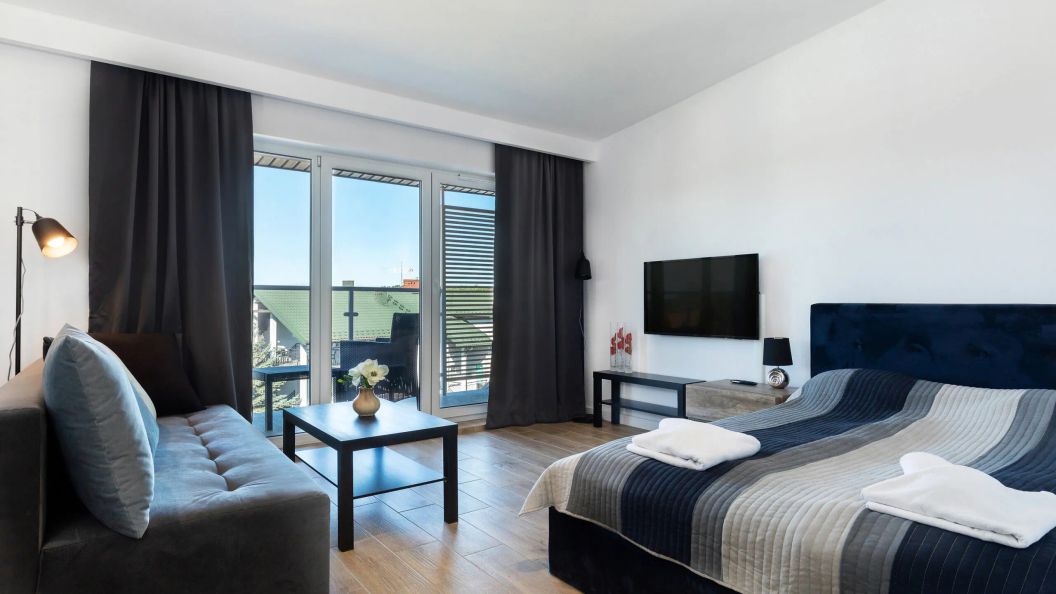 Apartament oferuje przestrzeń dla maksymalnie 4 osób w ramach jednego, otwartego pomieszczenia. Część dzienna została wyposażona w podwójne łóżko, rozkładaną sofę oraz telewizor z dostępem do kanałów polskich i niemieckich. Do dyspozycji gości jest również w pełni funkcjonalny aneks kuchenny, w którym znajduje się płyta indukcyjna, kuchenka mikrofalowa, lodówka, a także ekspres do kawy, toster i komplet naczyń. Łazienka posiada kabinę prysznicową i suszarkę do włosów.