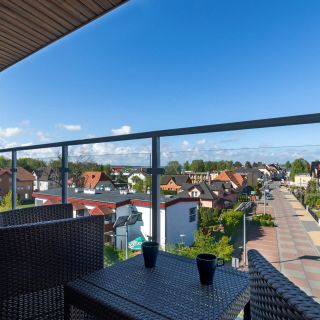 Niewątpliwym atutem apartamentu jest przestronny taras z meblami ogrodowymi, z którego roztacza się widok na Zatokę Wrzosowską.