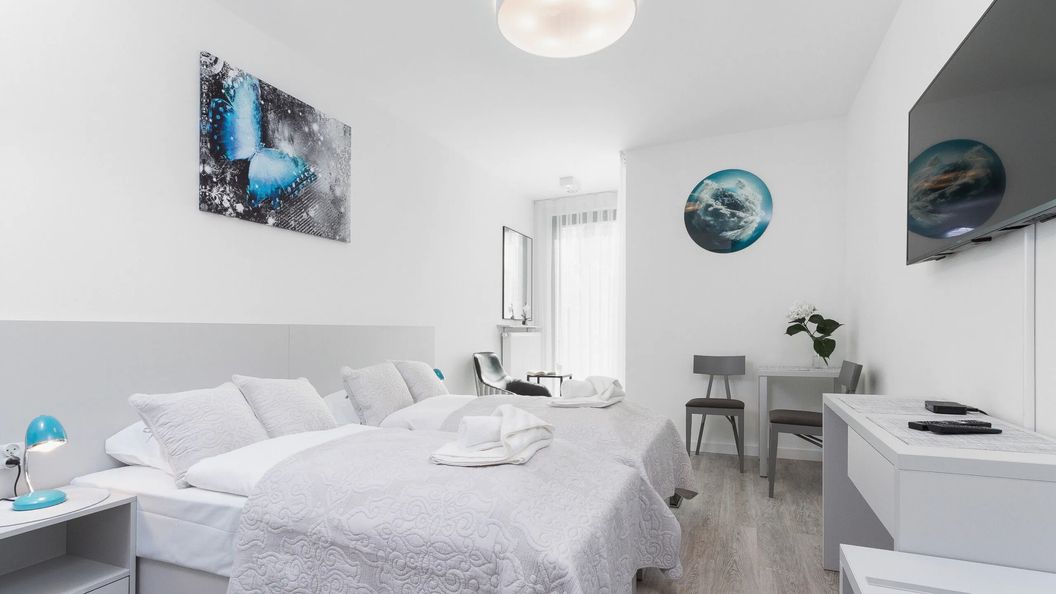 W pełni wyposażony apartament typu studio jest przeznaczony dla 2 osób. Studio składa się z pokoju dziennego, aneksu kuchennego i łazienki z prysznicem. W pełni klimatyzowane studio jest zaprojektowane tak, aby zapewnić maksymalny komfort i funkcjonalność. Wystrój w chłodnej kolorystyce, z minimalistycznymi spójnymi elementami dekoracyjnymi i eleganckimi meblami, tworzy wysoce nowoczesny miejski klimat. Jednocześnie studio jest bardzo gościnne i domowe dzięki szerokiej gamie udogodnień. Multimedia obejmują bezpłatne łącze Wi-Fi oraz telewizor z płaskim ekranem. Niezbędny sprzęt łazienkowy i kuchenny - mikrofalówka, ekspres do kawy, żelazko, suszarka do włosów - pozwalają gościom bezstresowo cieszyć się pobytem. Studio posiada przytulny balkon z widokiem na ulicę.
