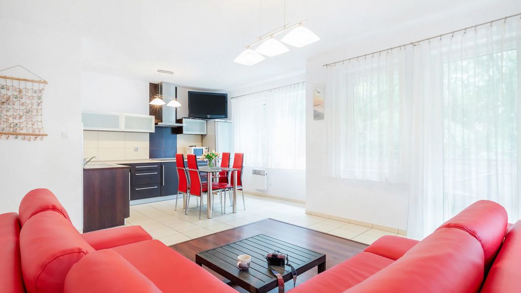 Przestrzeń apartamentu oferuje przestronny salon z aneksem kuchennym, sypialnię oraz łazienkę z prysznicem. Apartament wyróżnia się przytulnym wystrojem, estetyką oraz funkcjonalnością. Część dzienna wyposażona w rozkładaną sofę, TV z dostępem do internetu i wyjście na balkon stanowi doskonałe miejsce odpoczynku i relaksu, dodatkowo w pełni wyposażony aneks kuchenny umożliwia przyrządzenie posiłków. Przyjemny design oraz kompleksowe wyposażenie w niezbędne akcesoria kuchenne oraz łazienkowe gwarantują komfort pobytu. Apartament posiada przytulną sypialnię z podwójnym, wygodnym łóżkiem i rozkładaną sofą. Dodatkowo, rodzice podróżujący z dzieckiem mogą zarezerwować łóżeczko oraz krzesełko dla swojej pociechy.