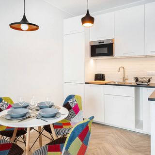 Zmywarka do naczyń, czajnik, lodówka z zamrażalką, płyta indukcyjna, mikrofala, ekspres do kawy, toster, szklanki, zestaw garnków, sztućców, patelnia