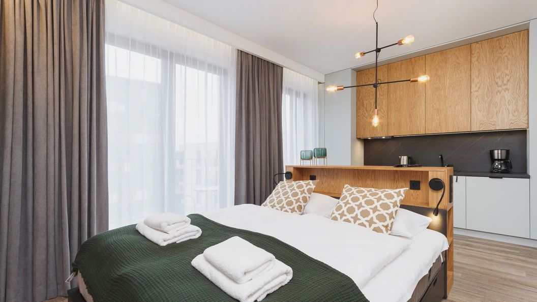 Apartament typu studio położony w nowoczesnym kompleksie „GO Apartaments” przy ulicy Rakowickiej w Krakowie, w niewielkiej odległości od Dworca Głównego i Starego Miasta.