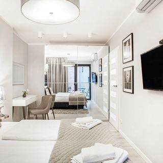 Jasny i funkcjonalnie rozplanowany apartament o powierzchni 45 metrów ma możliwość zakwaterowania 4 osób. Przestrzeń apartamentu oferuje część dzienną z aneksem kuchennym, sypialnie oraz łazienkę z wanną. Starannie wykończony salon wyposażony jest w stylową sofę, telewizor wyłącznie z funkcjami internetowymi (brak dostępu do kanałów telewizyjnych), balkon oraz w pełni wyposażony aneks kuchenny. Nowoczesny design oraz kompleksowe wyposażenie w niezbędne akcesoria kuchenne oraz łazienkowe gwarantują komfort pobytu. Apartament to przede wszystkim wnętrze o wyjątkowym klimacie, łączącym industrialną estetykę z funkcjonalnością. Dobór kolorystyki wnętrza i wysokiej jakości wyposażenie podkreślają wysoki i nowoczesny standard mieszkania.