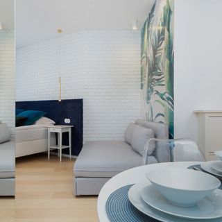 To w pełni wyposażone, klimatyzowane studio jest przeznaczone dla 4 osób. Przestrzeń mieszkalna składa się z pokoju dziennego z aneksem kuchennym oraz łazienki z prysznicem. Studio stwarza przytulną atmosferę dzięki jasnemu wnętrzu ożywionemu przez kolorowy wystrój i tapety z motywami tropikalnymi. Komfort pobytu jest gwarantowany przez funkcjonalny design i nowoczesne udogodnienia. Wśród udogodnień znajduje się klimatyzacja, bezpłatne łącze WiFi, telewizor z płaskim ekranem oraz kompleksowe wyposażenie kuchni i łazienki. Ze studia rozciąga się wspaniały widok na Stadion Narodowy. Studio posiada prywatny przeszklony balkon wyposażony w meble ogrodowe.