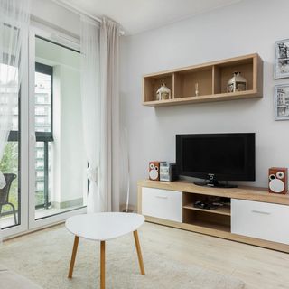 Rozkładana sofa, telewizor, stolik kawowy