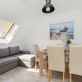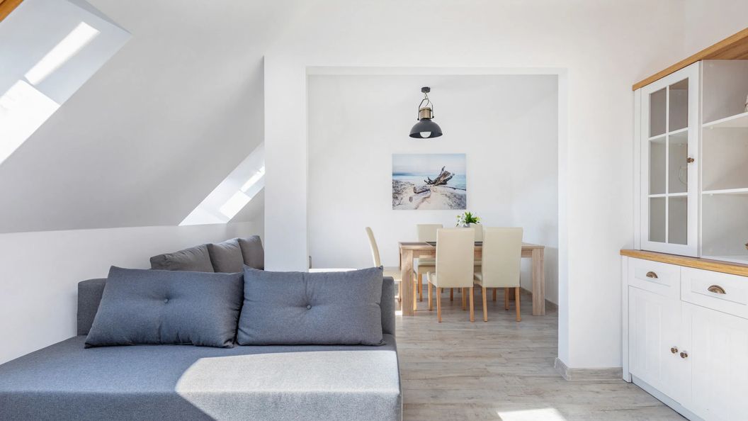 Apartament Turystyczna 2B to doskonały wybór na wakacje z rodziną lub przyjaciółmi. Ten przestronny apartament o powierzchni 100 metrów kwadratowych może wygodnie ugościć do 8 osób. Apartament składa się z 3 sypialni, pokoju dziennego, kuchni oraz 2 łazienek z prysznicem. Podróżujesz z małymi dziećmi? Nie ma problemu, apartament może być również wyposażony w łóżeczko dziecięce i krzesełko dziecięce na życzenie. Jasna przestrzeń oświetlona słońcem z okien na skośnych ścianach oraz drewniane schody nadają temu apartamentowi wyjątkowy charakter. Wygodę każdego pobytu zapewniają nowoczesne udogodnienia, takie jak bezpłatne łącze WiFi, telewizor z płaskim ekranem oraz kompleksowe wyposażenie kuchenne i łazienkowe.