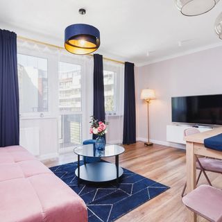 Ten apartament przeznaczony jest dla 4 osób. Charakteryzuje się wykończeniem w nowoczesnym, funkcjonalnym stylu. Składa się z salonu z podwójną rozkładaną sofą oraz sypialni z łóżkiem małżeńskim. Do dyspozycji gości znajduję się również osobna kuchnia wyposażona w najpotrzebniejsze sprzęty do przyrządzenia samodzielnie posiłku, takie jak piekarnik, mikrofalówka czy zmywarka oraz łazienka z prysznicem i pralką. Apartament posiada także balkon. Klimatyczna aranżacja przestrzeni oraz stylowo dobrana kolorystyka wnętrza zapewnia mieszkaniu przytulny i komfortowy klimat.