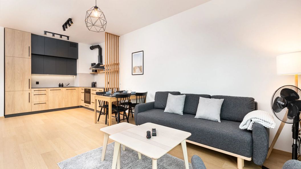 Apartament jest nowoczesny, wygodny i przeznaczony dla maksymalnie czterech osób. Powierzchnia mieszkalna składa się z salonu, oddzielnej sypialni oraz łazienki z prysznicem. Przestrzeń jest bardzo funkcjonalna, posiada wygodne łóżko małżeńskie, rozkładaną dwuosobową sofę, miejsce do pracy oraz w pełni wyposażony aneks kuchenny. Apartament cechuje się nowoczesnym charakterem dzięki stylowemu wystrojowi z ciepłymi drewnianymi elementami i szerokiej gamie udogodnień. Udogodnienia obejmują bezpłatne łącze Wifi, telewizor z płaskim ekranem oraz kompleksowe wyposażenie kuchni i łazienki (np. zmywarka, mikrofalówka, pralka). Goście mogą zrelaksować się na prywatnym, przeszklonym balkonie wyposażonym w meble ogrodowe. W hali garażowej goście mogą parkować na prywatnym, wyznaczonym miejscu, co jest ważnym udogodnieniem w czasie sezonu turystycznego.