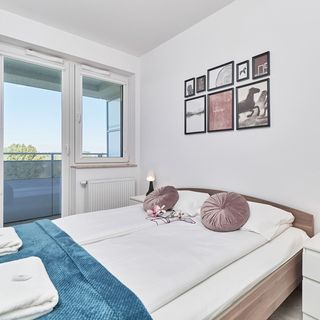 Podwójne łóżko, pościel, szafki nocne, wyjście na balkon, szafa