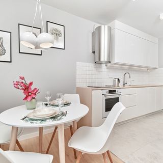 Stół z 3 krzesłami, ekspres do kawy, płyta indukcyjna, piekarnik, lodówka z zamrażarką, zmywarka, czajnik elektryczny, szklanki, kubki, komplet naczyń i sztućców, patelnia