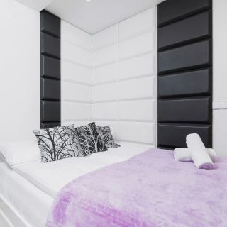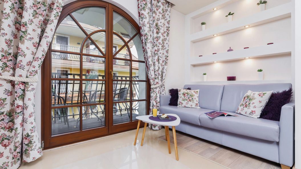 Przestrzeń apartamentu przeznaczona jest dla maksymalnie 4 osób. Została ona podzielona na oddzielną sypialnię z łóżkiem małżeńskim oraz salon z rozkładaną, 2-osobową sofą. Do dyspozycji gości są również dwa balkony z widokiem na wewnętrzny dziedziniec.