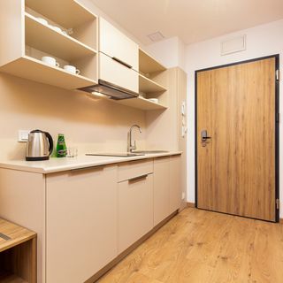 Aneks kuchenny, płyta indukcyjna, czajnik elektryczny, lodówka, naczynia kuchenne i stołowe