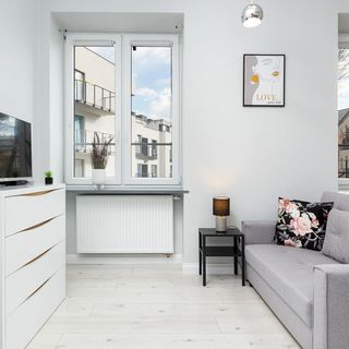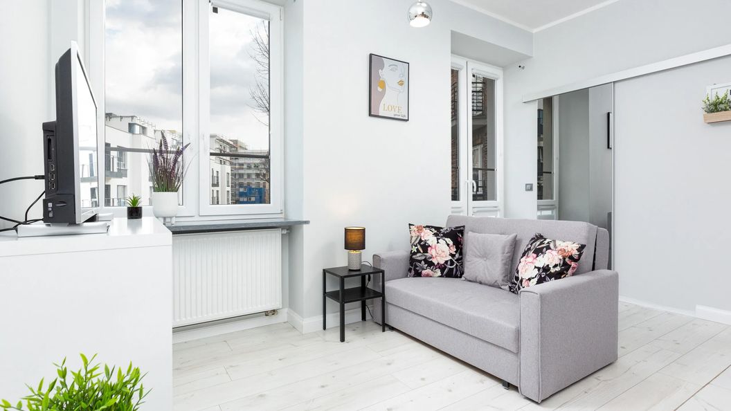 Rozkładana sofa, TV, stolik kawowy, komoda, wyjście na balkon
