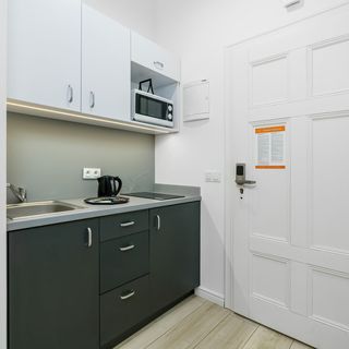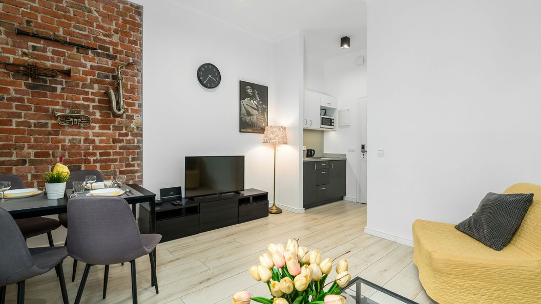 To przytulne studio będzie idealne dla pary! Apartament posiada w pełni wyposażony aneks kuchenny z płytą elektryczną, mikrofalówką, lodówką oraz wszystkimi niezbędnymi naczyniami do gotowania i serwowania posiłków. Do dyspozycji gości jest również pięknie zaprojektowany salon z telewizorem z płaskim ekranem, rozkładaną sofą, rozkładanym fotelem, szafą z lustrem i stołem z 3 krzesłami. Goście mogą również w pełni korzystać z szybkiego internetu Wifi.