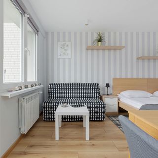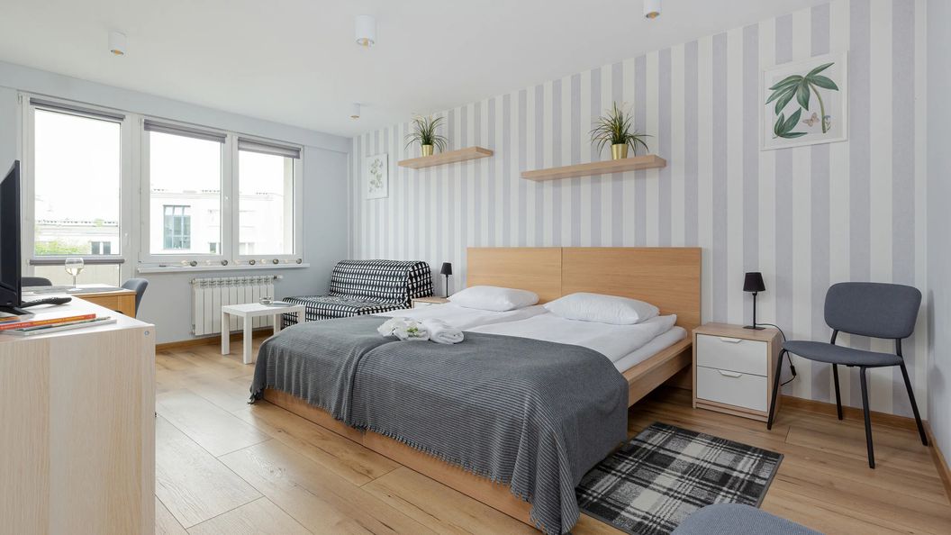 Apartament typu studio położony w spokojnej okolicy, w sąsiedztwie Bulwaru nad Wisłą, znajduje się na 5 piętrze i może ugościć 3 osoby. Na powierzchnię apartamentu składa się salon z aneksem kuchennym, oraz łazienka z prysznicem i toaletą. Układ spania obejmuje dwa pojedyncze łóżka i jedną jednoosobową rozkładaną sofę, dzięki czemu studio jest idealnym wyborem na podróż służbową lub wypad z przyjaciółmi. Jasny, kremowy wystrój wnętrza wprowadza domową atmosferę. Studio posiada również prywatny balkon od strony południowej. Szeroki wachlarz przydatnych udogodnień zapewnia komfort pobytu. W pełni wyposażony aneks kuchenny, z mikrofalówką, zmywarką i kuchenką indukcyjną, sprawia, że przygotowanie ulubionych posiłków staje się przyjemnością. Pakiet multimediów obejmuje telewizor z płaskim ekranem oraz bezpłatne łącze internetowe Wi-Fi. W łazience nasi goście znajdą suszarkę do włosów oraz pralkę. Aby każdy pobyt był udany, zapewniono bezpłatny zestaw kosmetyków, pościel i ręczniki.