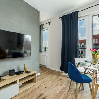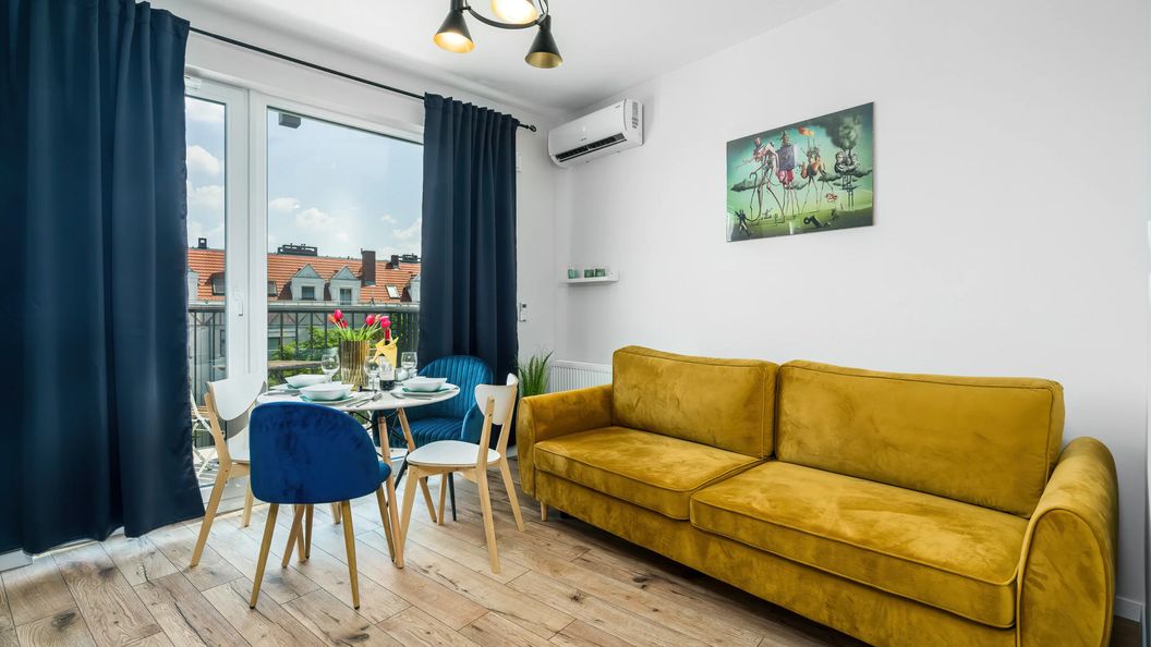 Rozkładana sofa, TV, stolik kawowy, wyjście na balkon