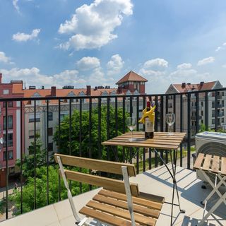 Stylowy apartament odpowiedni dla 4 osób lub pary. Składa się z salonu, 1 sypialni, aneksu kuchennego oraz łazienki z wanną, jest również balkon z meblami ogrodowymi, gdzie można delektować się poranną kawą z widokiem na miasto.