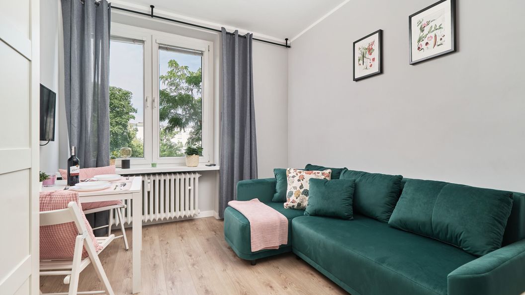 Przytulne studio idealne dla pary! Jeśli szukasz przytulnego miejsca do wspólnego spędzenia czasu - to zakwaterowanie będzie właściwym wyborem! Apartament posiada w pełni wyposażony aneks kuchenny z płytą indukcyjną, mikrofalą, lodówką oraz wszystkimi niezbędnymi przyborami kuchennymi. Pięknie urządzony salon wyposażony jest w telewizor z płaskim ekranem, wygodną rozkładaną sofę i dużą szafę. Łazienka wyposażona jest w kabinę prysznicową, znajdziesz tam również ręczniki i zestaw kosmetyków. Goście mogą również w pełni korzystać z szybkiego Internetu Wi-Fi oraz takich udogodnień jak odkurzacz, żelazko i suszarka do włosów. Dostępna jest również pralka z suszarką, która znajduje się w części wspólnej.