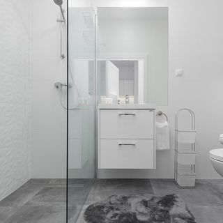 Kabina typu walk-in, toaleta, umywalka, lustro, ręczniki, suszarka do włosów, pralka