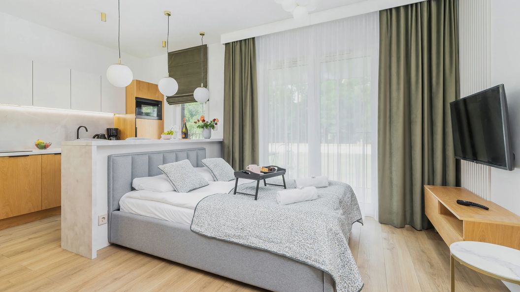 W pełni wyposażony apartament typu studio może gościć do 2 osób. Składa się z pokoju z aneksem kuchennym i łazienki z prysznicem. Wszystkie elementy mieszkania współgrają ze sobą, gwarantując maksimum komfortu. Na wyposażonym w meble balkonie goście mogą się zrelaksować przy widoku na pobliską zieleń. Odpoczynek możliwy jest również dzięki bardziej nowoczesnej rozrywce: multimedia w apartamencie obejmują telewizor z płaskim ekranem. Inne udogodnienia to kompleksowy zestaw urządzeń kuchennych i łazienkowych (pralka, ekspres do kawy, suszarka do włosów) oraz powitalny pakiet kosmetyków, ręczników i pościeli. W apartamencie znajduje się także wiatrak, który da trochę ochłody, szczególnie w ciepłe dni.