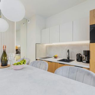Lodówka, czajnik, płyta indukcyjna, ekspres do kawy, szklane kubki, zestaw naczyń, sztućce, patelnia, mikrofalówka, zmywarka
