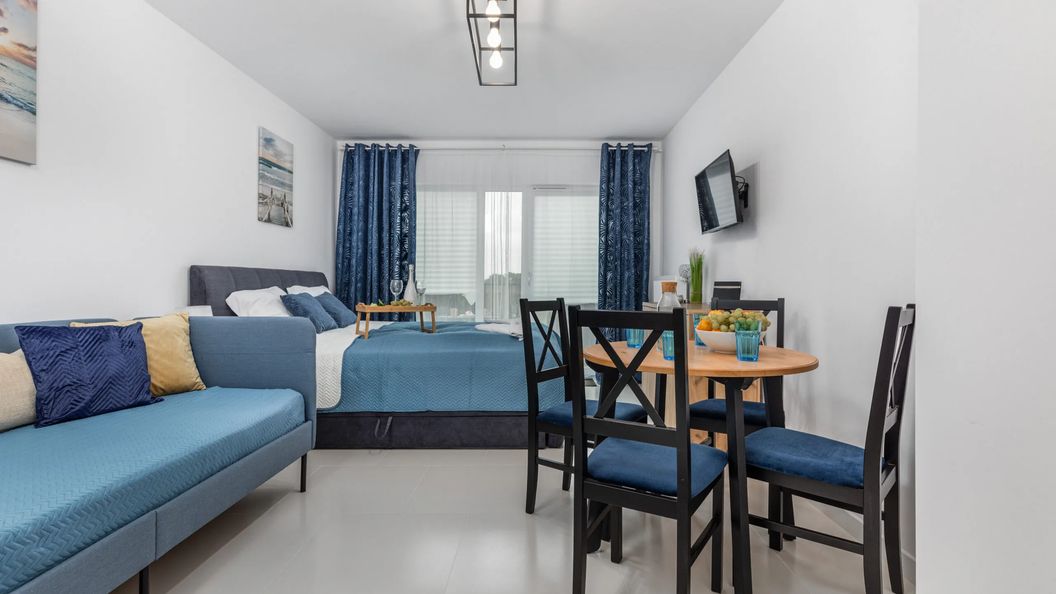 Apartament znajduje się na 4. piętrze i ma możliwość zakwaterowania 3 osób. Przestrzeń apartamentu oferuje salon z aneksem kuchennym, balkon oraz łazienkę z prysznicem. Balkon z meblami balkonowymi, będzie świetnym miejscem na relaks. Apartament wyróżnia się nowoczesnym wystrojem, estetyką oraz funkcjonalnością. Część dzienna wyposażona w rozkładaną sofę, wygodne łóżko i TV stanowi doskonałe miejsce odpoczynku i relaksu, dodatkowo w pełni wyposażony aneks kuchenny umożliwia przyrządzenie ulubionych posiłków. Przyjemny design oraz kompleksowe wyposażenie w niezbędne akcesoria kuchenne oraz łazienkowe gwarantują komfort pobytu. Rodzice podróżujący z dzieckiem znajdą na wyposażeniu również łóżeczko oraz krzesełko dla swojej pociechy.