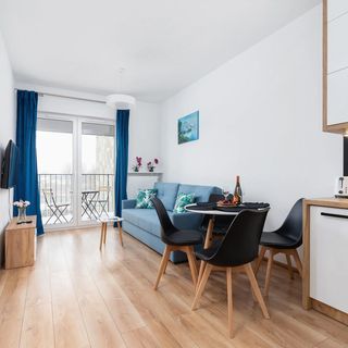 Stół z 4 krzesłami, podwójna rozkładana sofa, stolik kawowy, telewizor, wyjście na balkon