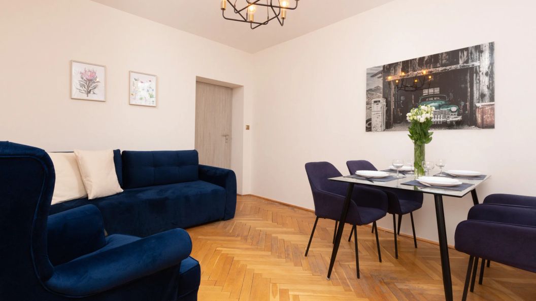 Przestrzeń przeznaczona jest dla maksymalnie 4 osób. Składa się z salonu z rozkładaną sofą oraz oddzielnej sypialni z podwójnym łóżkiem. W obu pomieszczeniach znajdują się telewizory z płaskim ekranem, co zapewnia komfortowy wypoczynek. Do apartamentu przynależy także prywatny balkon, z którego roztacza się widok na cichą ulicę i fragment panoramy miasta.