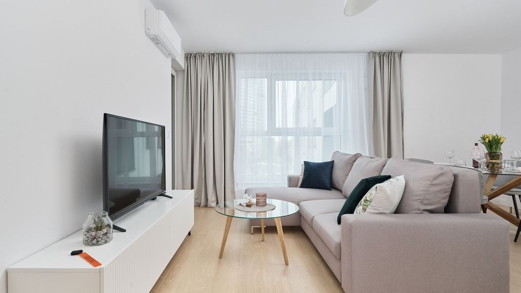 Apartament o wysokim standardzie mieści się na 6. piętrze nowoczesnego budynku i jest idealny dla pary lub 4 osób. Składa się z salonu, sypialni, aneksu kuchennego oraz łazienki z prysznicem. Z balkonu z meblami ogrodowymi rozpościera się widok na Sky Tower. Mieszkanie jest wykończone w nowoczesnym stylu i wyposażone we wszystko co potrzebne do komfortowego pobytu. Estetyczne dodatki i stownowana kolorystyka sprawiają, że w pokoju można odpocząć i zrelaksować się. Goście mogą korzystać z szybkiego Wi-Fi, zmywarki i telewizora z płaskim ekranem. W kuchni znajdują się również wszystkie naczynia i sztućce niezbędne do gotowania i serwowania posiłków.