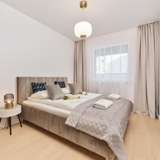 Mieszkanie znajduje się na pięknym osiedlu przy ulicy Gwiaździstej we Wrocławiu. W okolicy znajdują się trzy duże centra handlowe - Arkady Wrocławskie (650 m), Sky Tower (400 m) i Wroclavia (1 km). W pobliżu znajdują się również liczne sklepy spożywcze, piekarnia i kilka kwiaciarni. Dworzec kolejowy Wrocław Główny oddalony jest o 17 minut spacerem lub 5 minut jazdy samochodem. W zaledwie 4 minuty znajduje się przystanek tramwajowy - Zaolziańska. Dojazd tramwajem do centrum miasta zajmuje około 13 minut. Goście podróżujący samochodem mogą skorzystać z prywatnego miejsca parkingowego w garażu podziemnym.