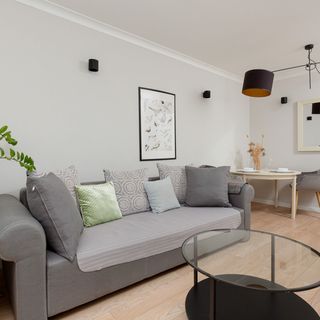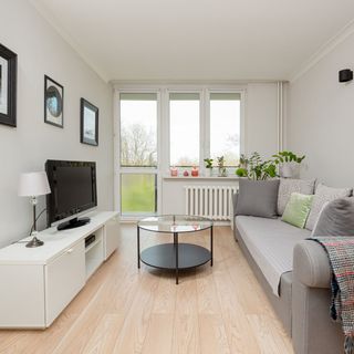 Podwójna rozkładana sofa, stolik kawowy, telewizor, stół z krzesłami, szafka RTV, wyjście na balkon