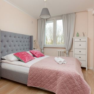 Podwójne łóżko, komoda, szafki nocne, lampki nocne