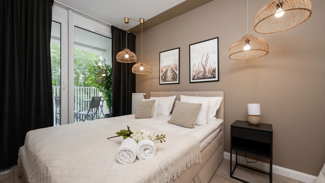 W tym w pełni wyposażonym apartamencie może wygodnie mieszkać do 4 osób. Funkcjonalnie zaaranżowana powierzchnia 33m² podzielona jest na salon z podwójną rozkładaną sofą, aneks kuchenny, sypialnię z podwójnym łóżkiem oraz łazienkę z kabiną prysznicową. Oba pokoje mają również wyjście na przytulny prywatny balkon wyposażony w meble ogrodowe, idealny do delektowania się poranną filiżanką kawy w promieniach słońca. Wnętrza charakteryzują się ponadczasową, a zarazem nowoczesną elegancją dzięki wystrojowi, który w gustowny sposób łączy zgrabne meble z ciepłymi, drewnianymi detalami. Szeroki wachlarz udogodnień zaspokaja wszystkie potrzeby gości. Udogodnienia obejmują multimedia (telewizor SmartTV z płaskim ekranem i kanałami telewizji kablowej oraz bezpłatny dostęp do sieci Wi-Fi), a także wszystkie niezbędne urządzenia gospodarstwa domowego (m.in. pralka, zmywarka, ekspres do kawy, sprzęt do prasowania). Aby ułatwić rozpoczęcie każdego pobytu, zapewniono bezpłatny zestaw kosmetyków, ręczniki i pościel.